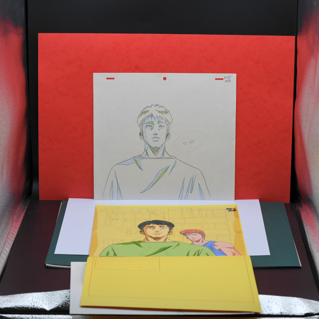 This stunning 2-layer cel includes two matching dougas, all housed in the original studio envelope, making it an exceptional collector’s item. Created by the legendary mangaka Takehiko Inoue, Slam Dunk aired from 1993 to 1996, produced by Toei Animation. The anime's cultural impact is undeniable, cementing itself as one of the greatest sports anime of all time, with its compelling portrayal of basketball, camaraderie, and personal growth.