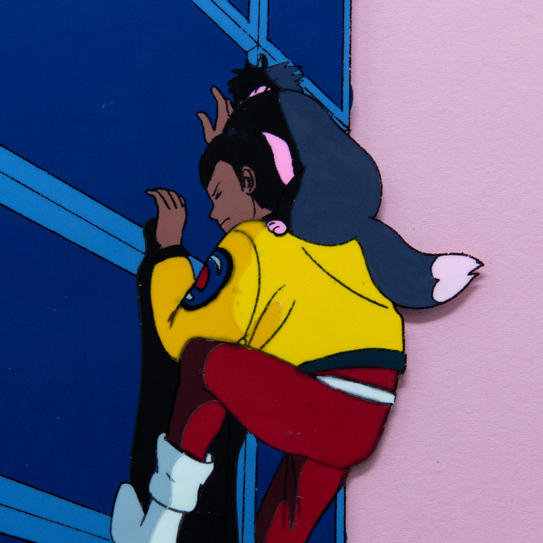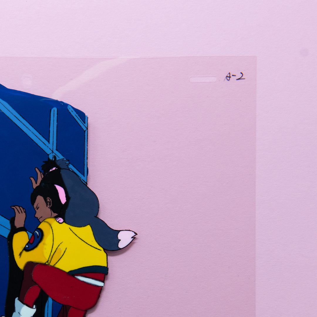 Ascend to new heights of nostalgia with this original production cel from 'Rock 'n Cop,' capturing Ryuu Urashima in a charming scene as he climbs with his feline companion Mya . Crafted during the production of the series by Tatsunoko Productions, this rare collector's item offers a delightful glimpse into the whimsical world of the acclaimed anime.