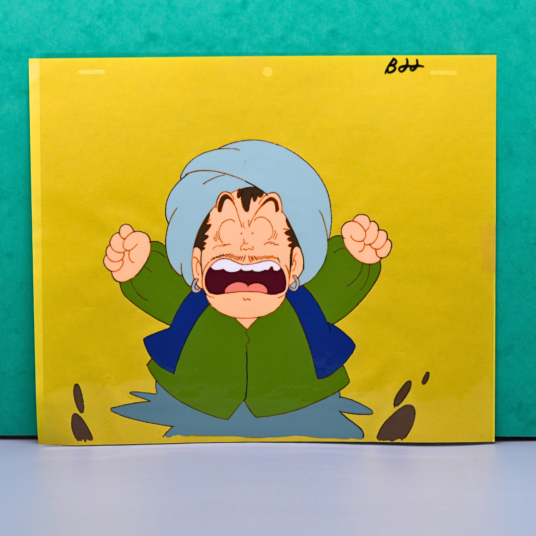 Original production cel featuring Senbei Norimaki dressed as a sultan, shaking with over-the-top rage. Hand-painted cel on cellulose acetate, capturing the eccentric inventor in a moment of pure comedic chaos.