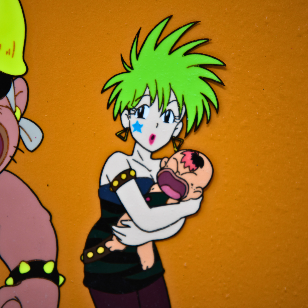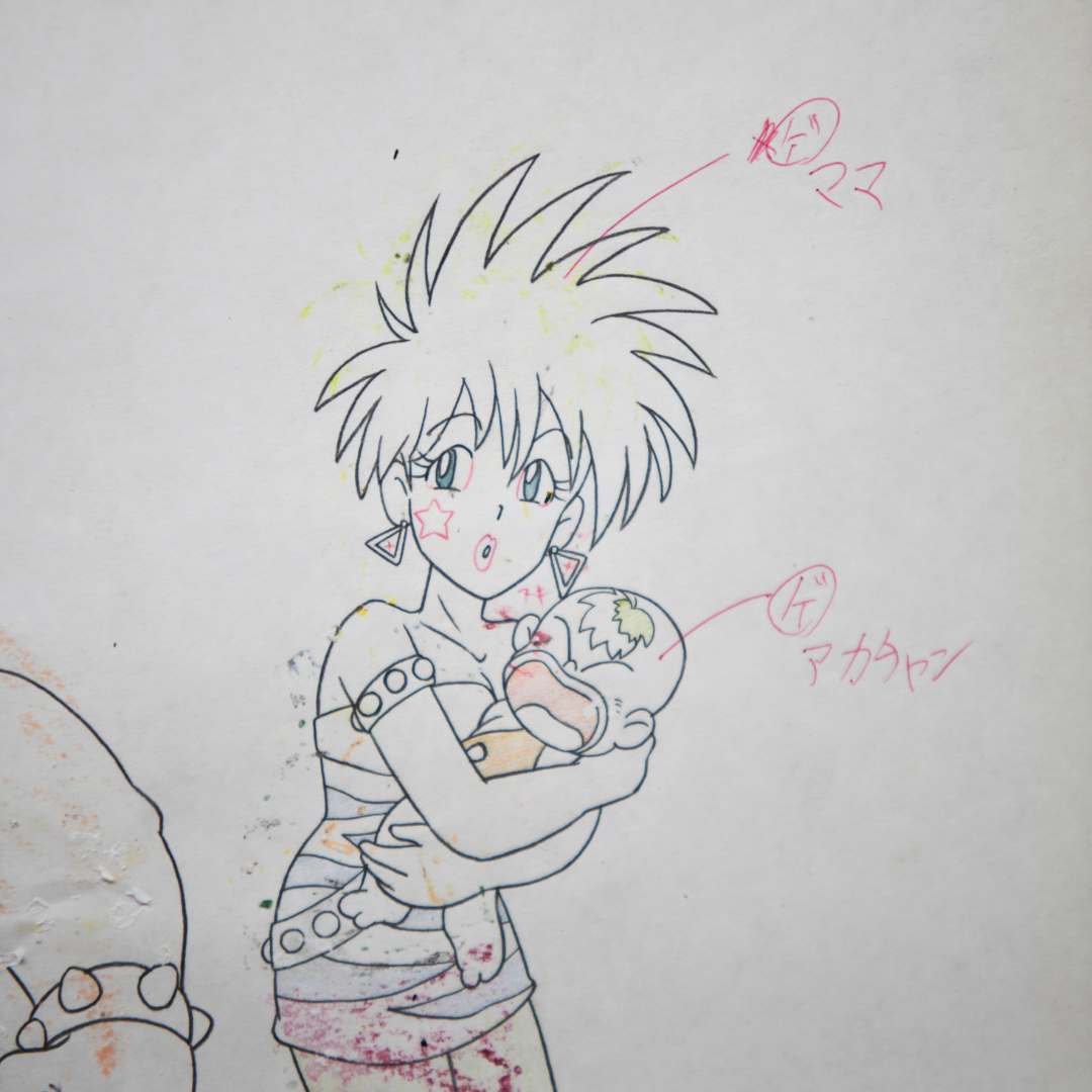 This original production cel and douga from Eddoko Boy Gatten Tasuke features a striking moment with a punk character holding a baby alongside a villain wearing a helmet.