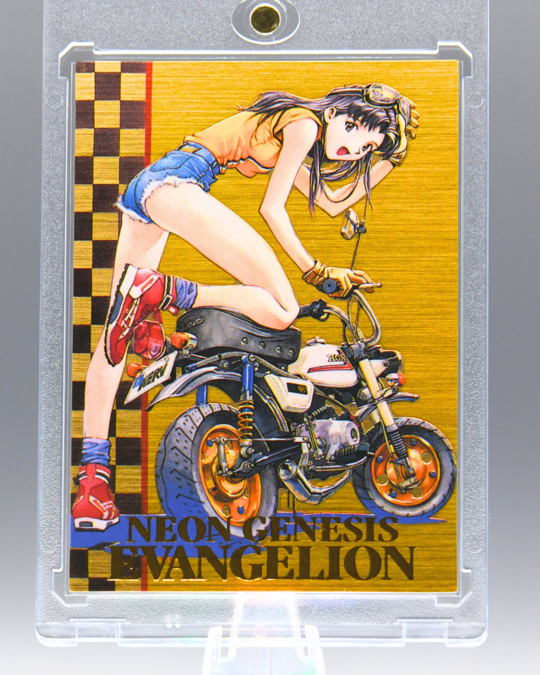Rare Evangelion collectible featuring Misato Katsuragi, the iconic character from the legendary series, with a stunning gold-foil finish.