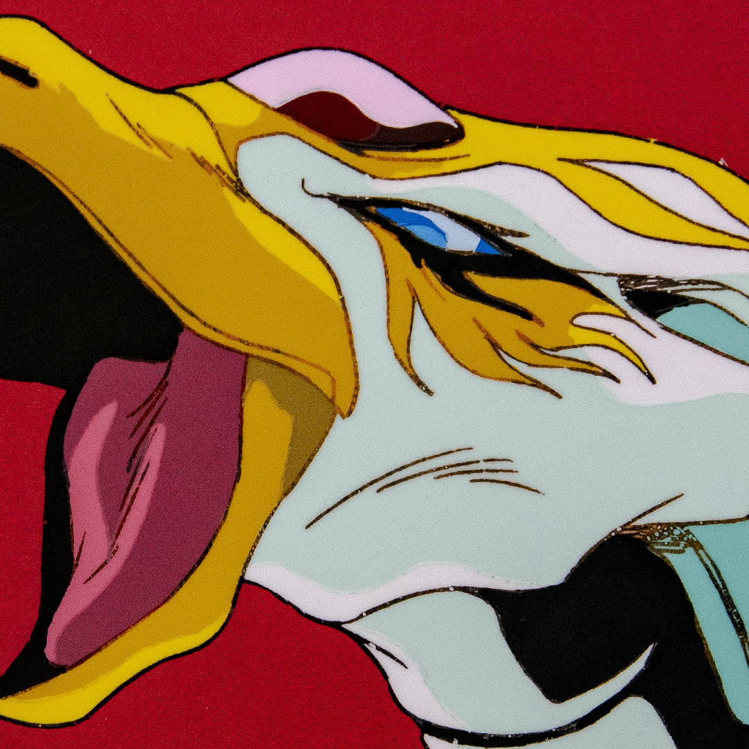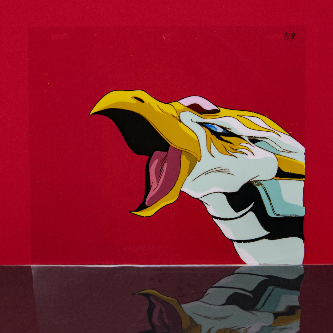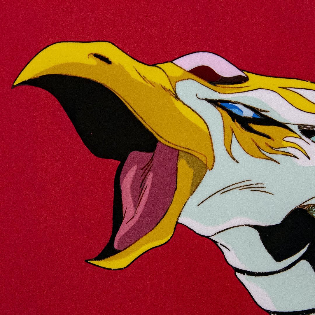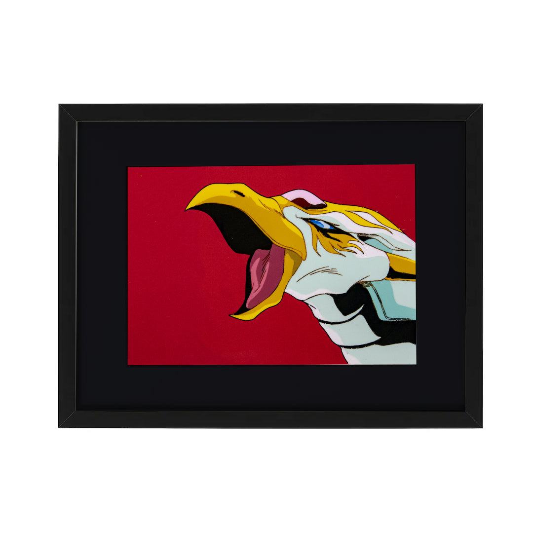This beautiful cel captures an intense close-up of the magical bird Thunder Liger, showcasing the distinctive character design and artistic style that made Go Nagai's work so influential. The detailed facial expression and feather work demonstrate the high quality of animation in this classic series.