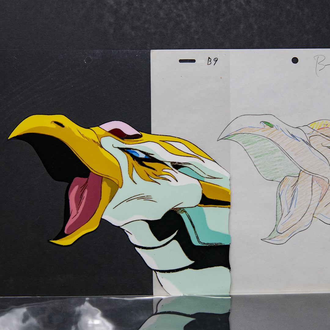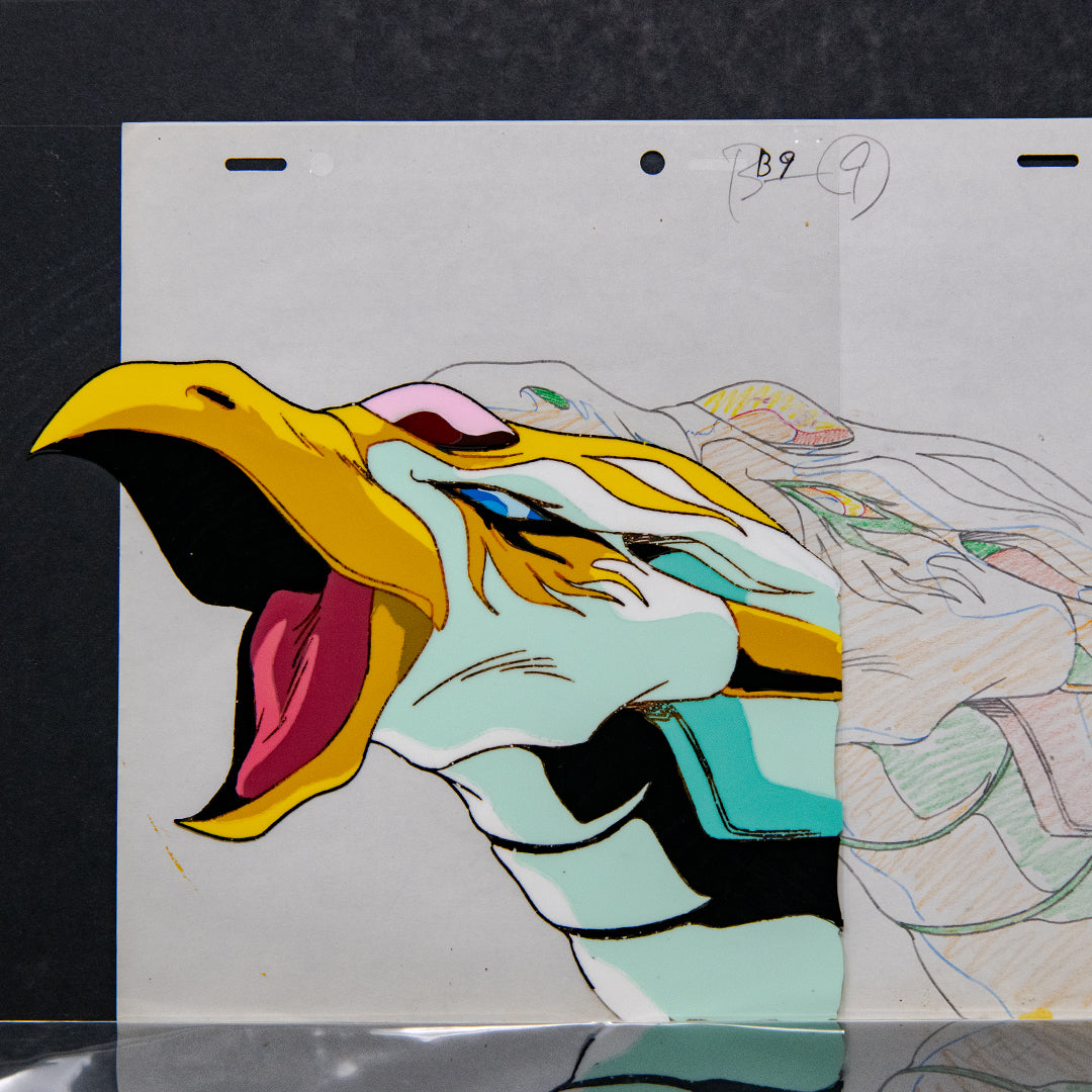 Original production cel and matching douga (original pencil drawing) from episode 28 of "Juchin Liger" (Thunder Liger), featuring a striking close-up of the magical bird character. This series is notably created by legendary manga artist Go Nagai, famous for his groundbreaking works including Mazinger Z, Devilman, and Cutie Honey.