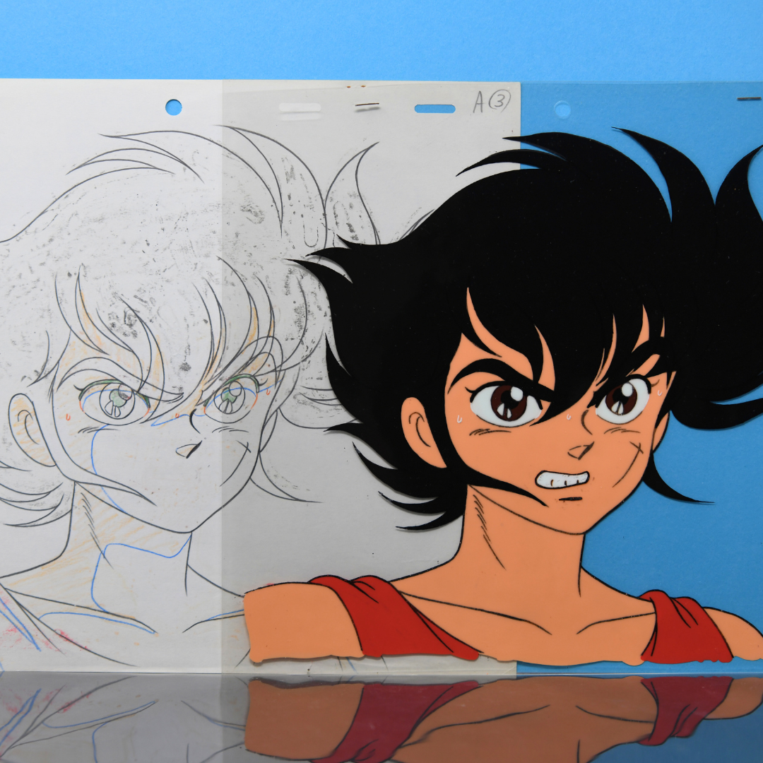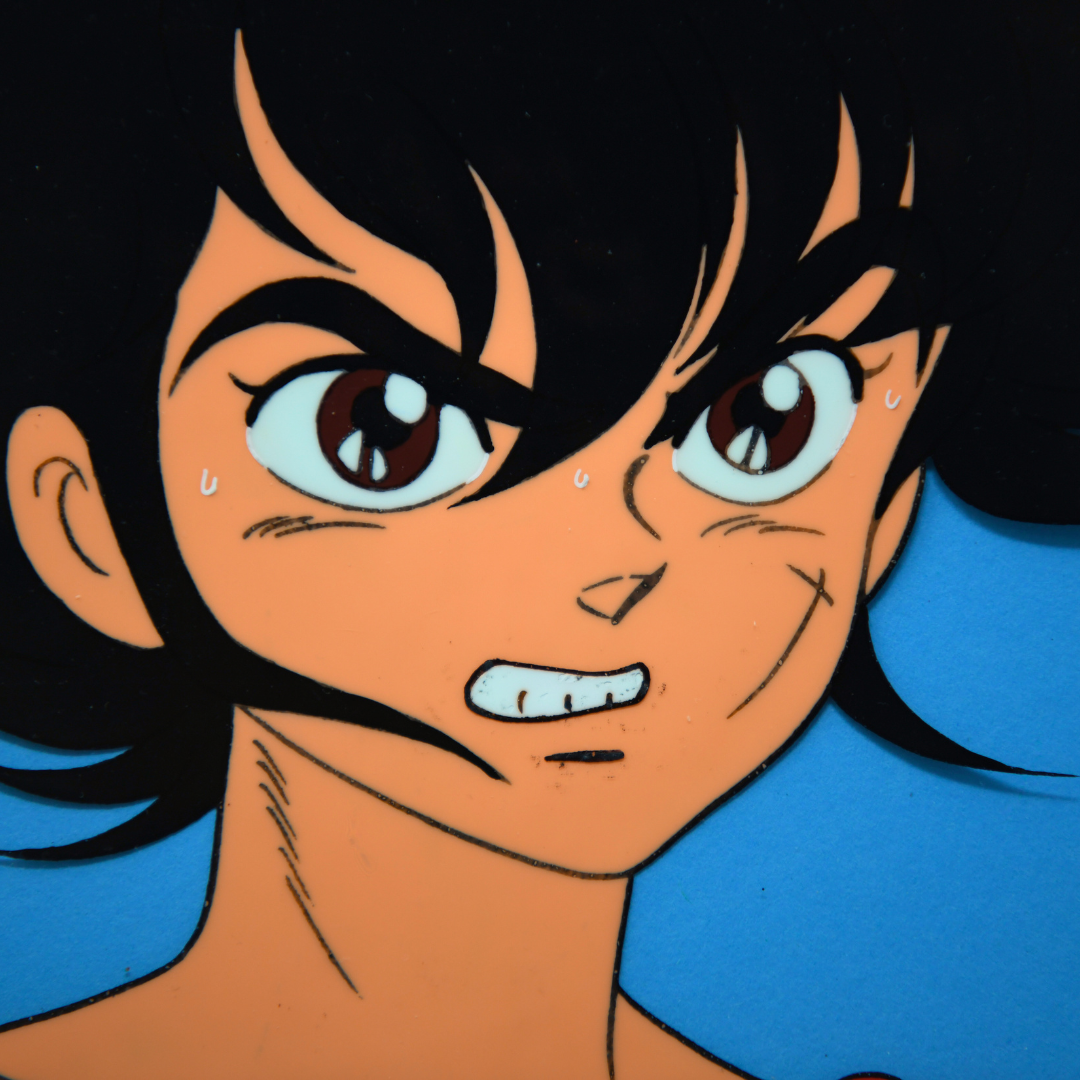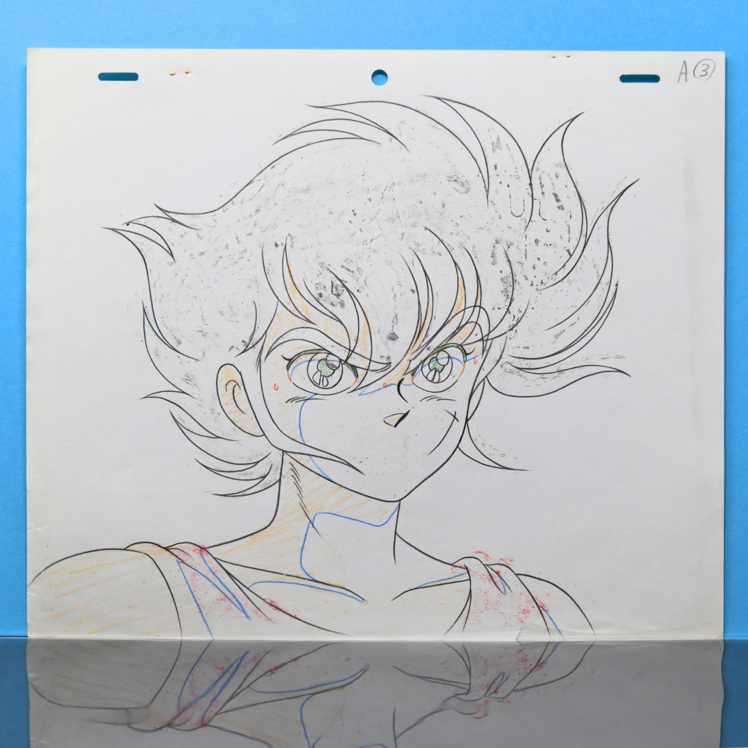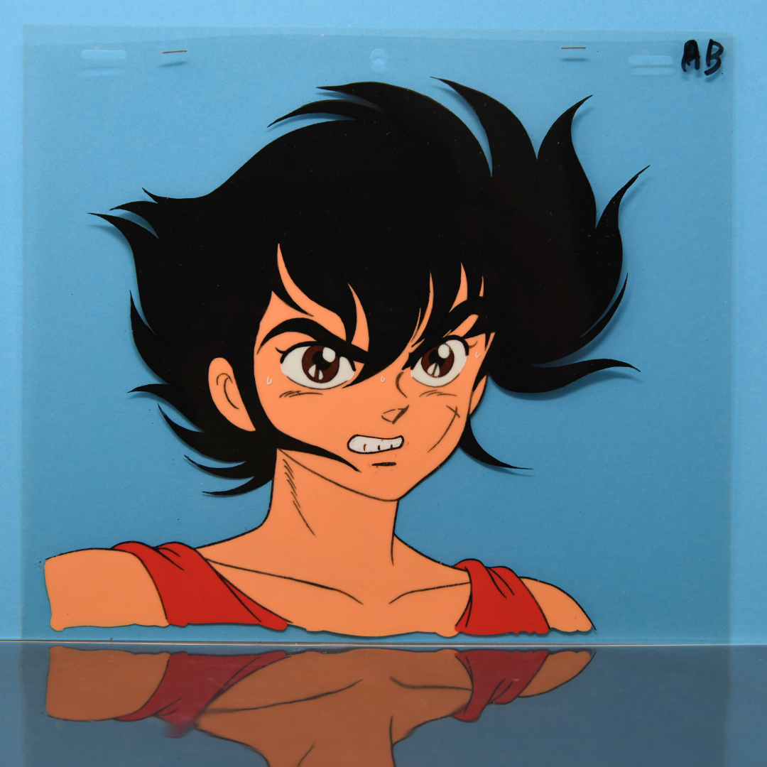 This compelling cel showcases Ken Taiga's expressive face in remarkable detail, highlighting the character's determination and intensity. Close-up character shots are highly sought after by collectors for their dramatic impact and detailed artwork. The accompanying douga reveals the skilled draftsmanship behind this powerful image.