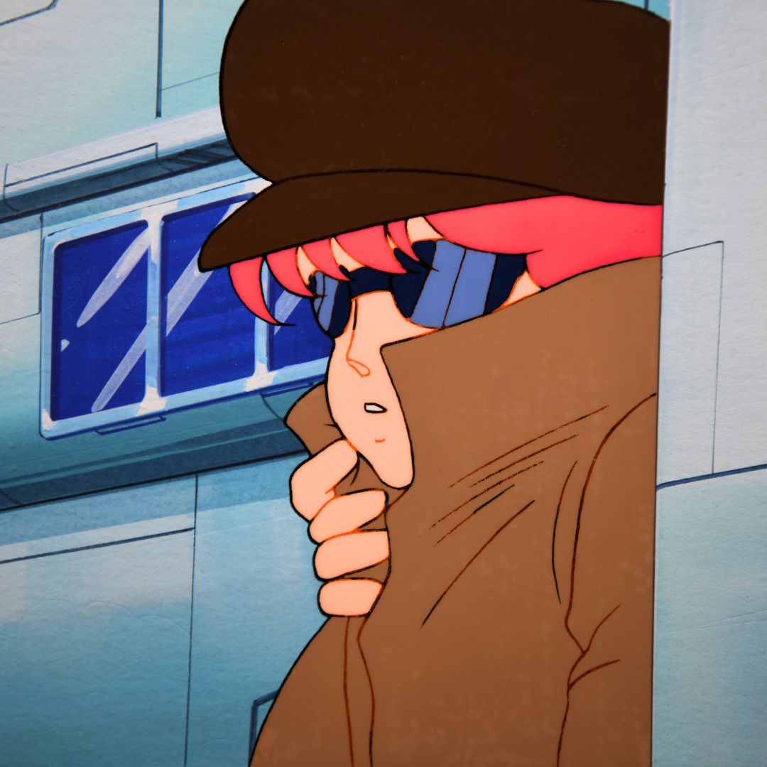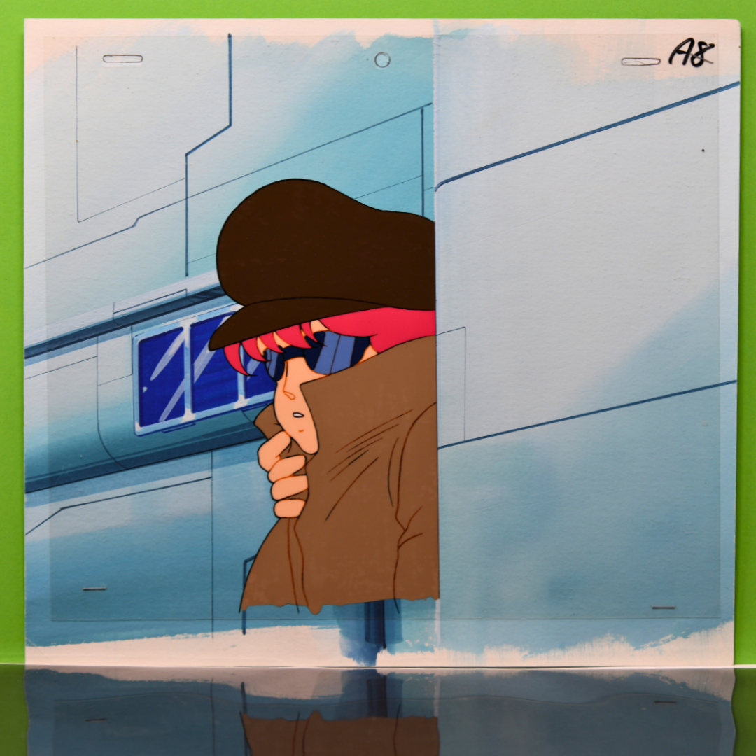 This original production cel with a hand-painted background from Magical Princess Minky Momo: Hold on to Your Dreams features Gigi in her detective form, accompanied by an intricately detailed original background.