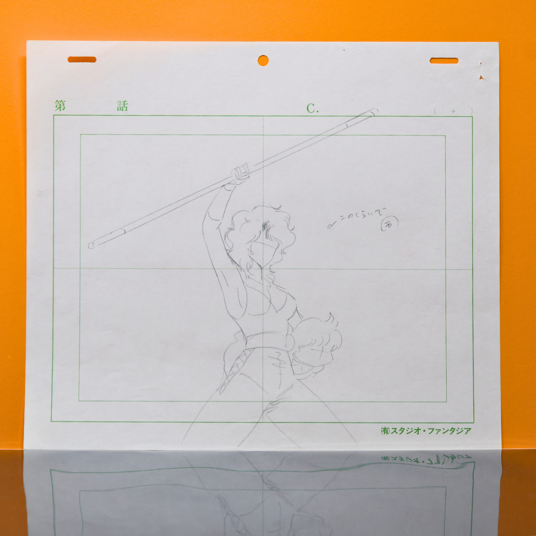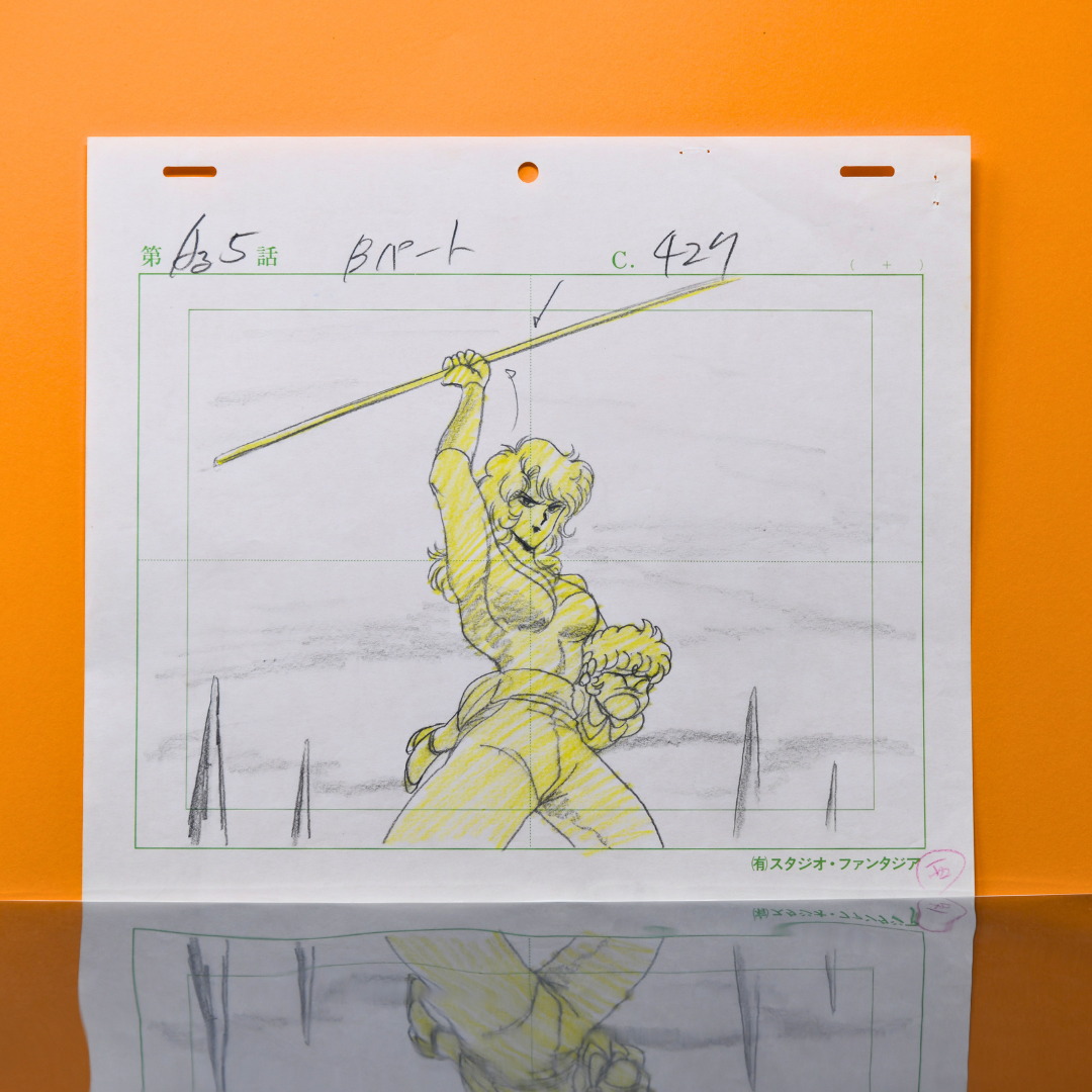 The set includes an original production cel, matching douga, storyboard, and a stunning hand-painted background, offering a complete view of the animation process.