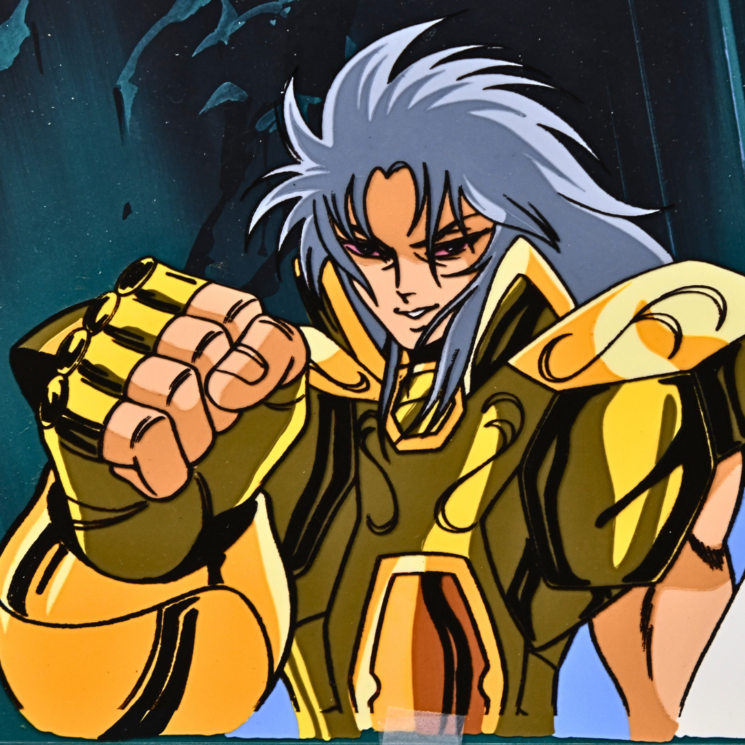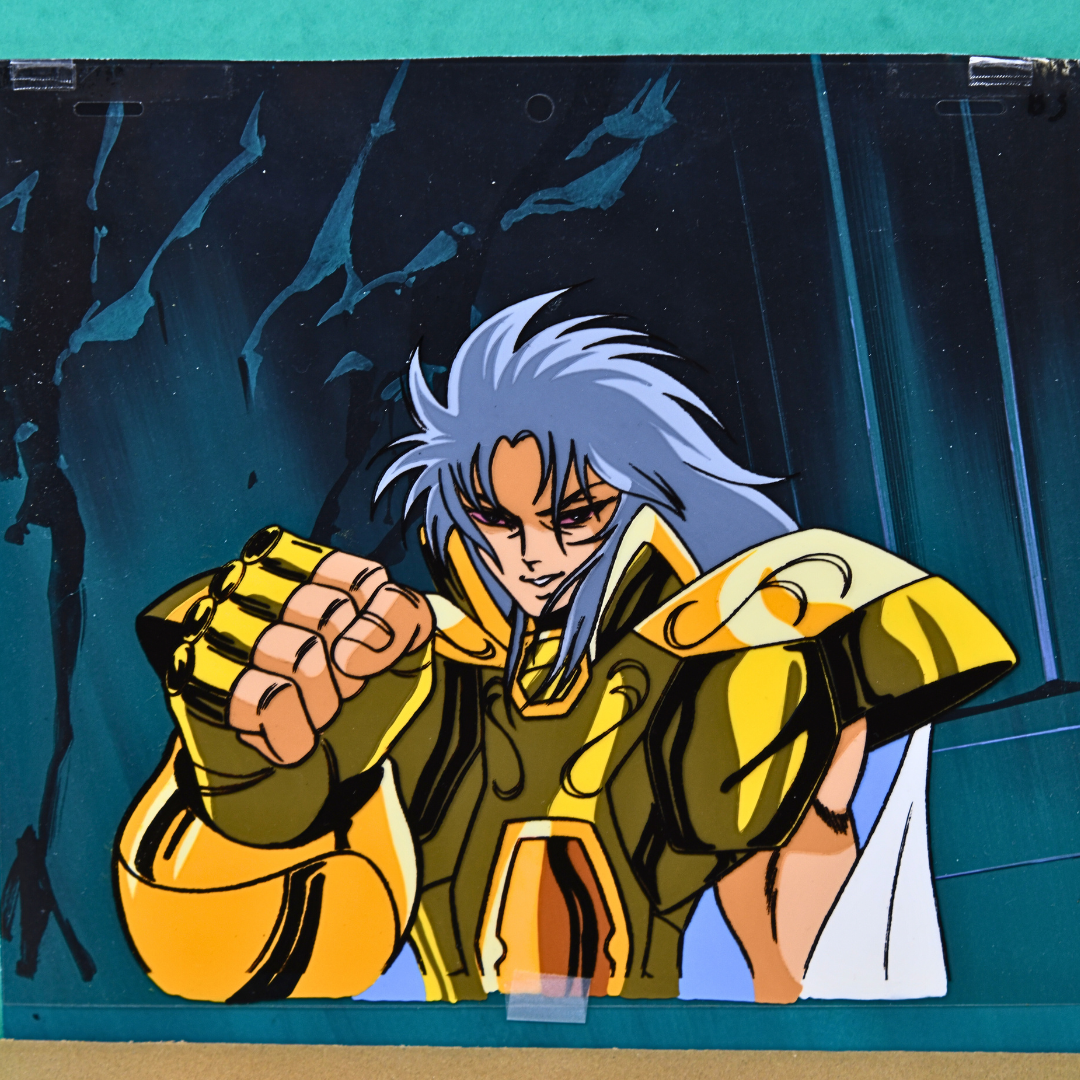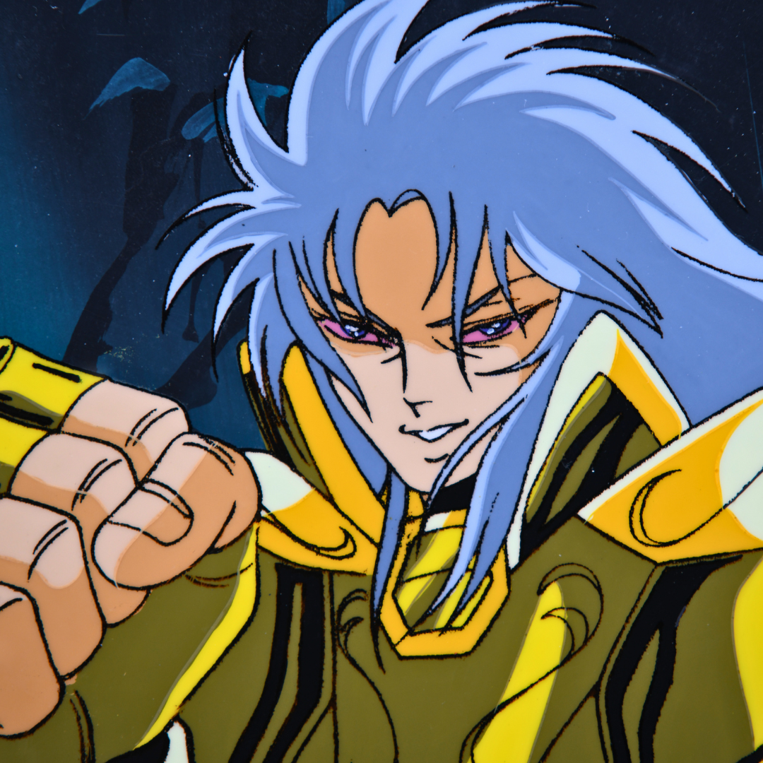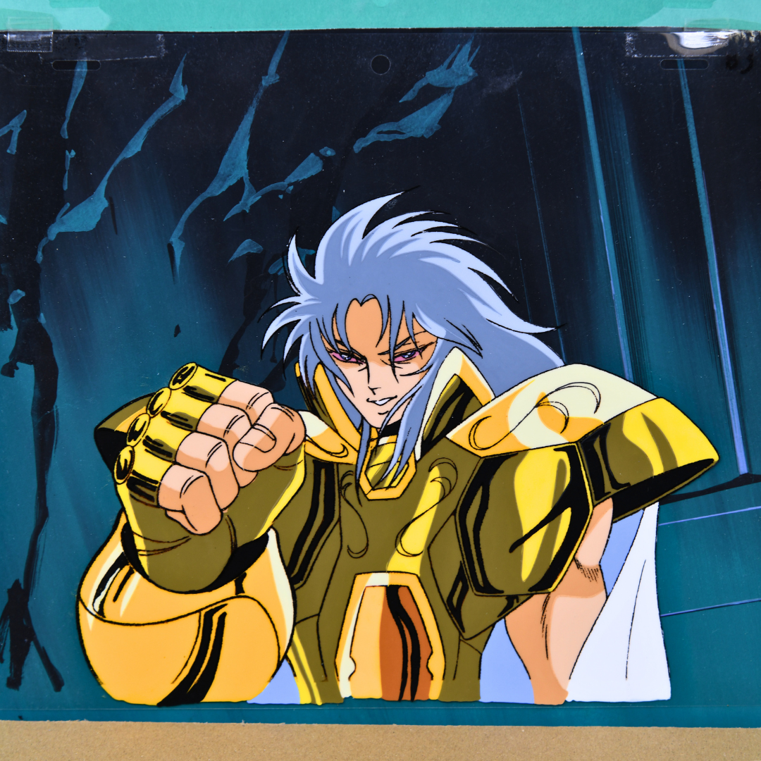 This original anime production cel and douga set features the formidable Saga, the Gemini Saint, during a critical battle from episode 73 of Saint Seiya.
