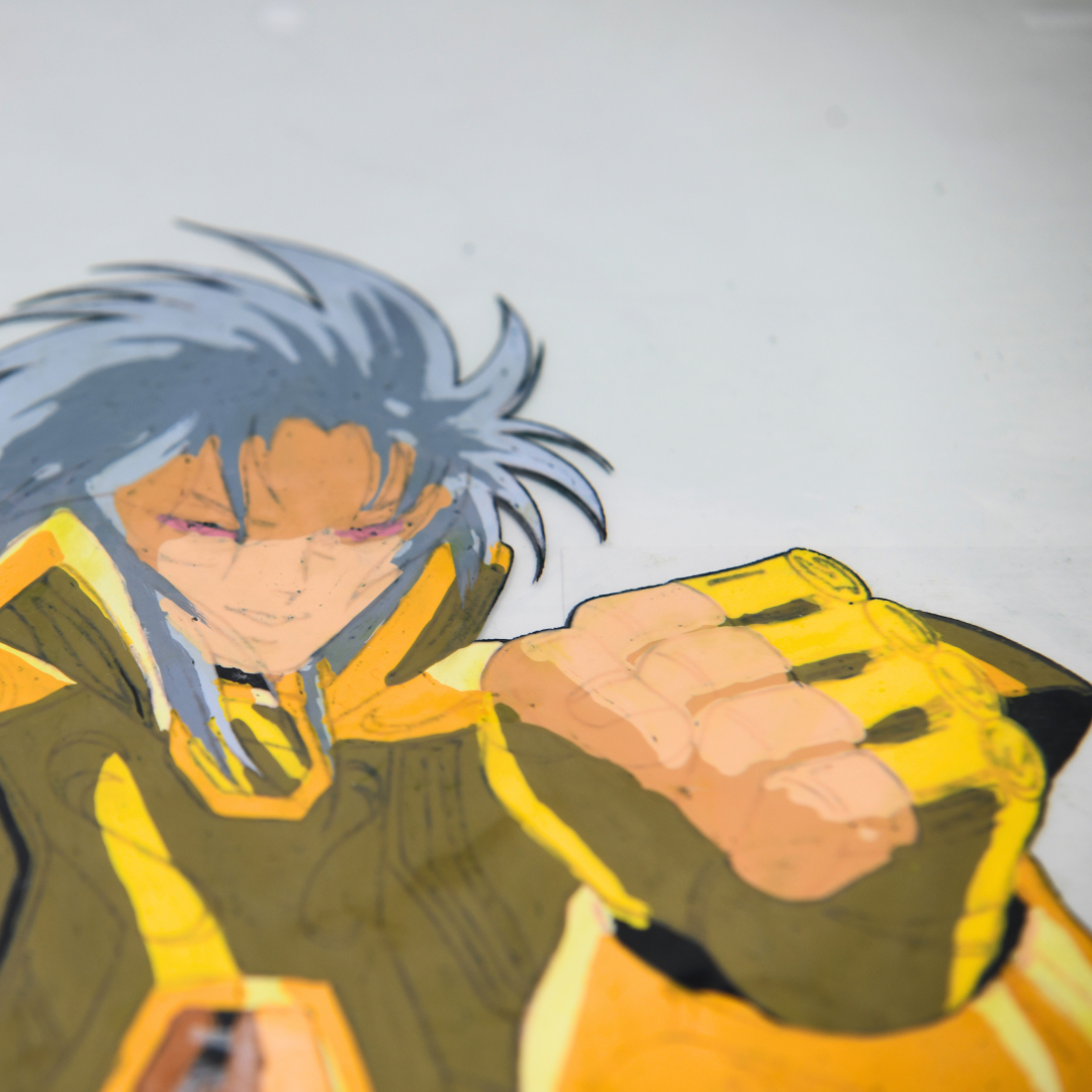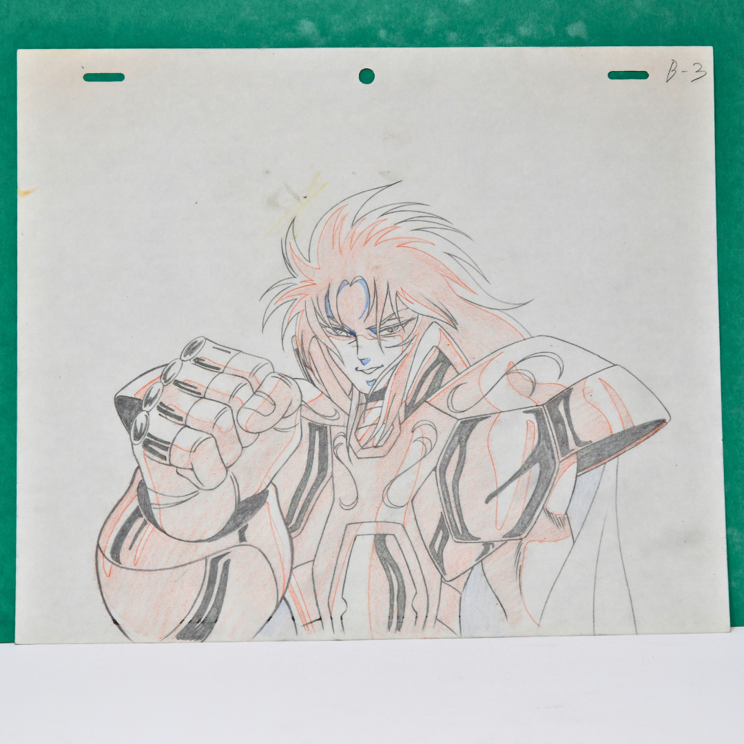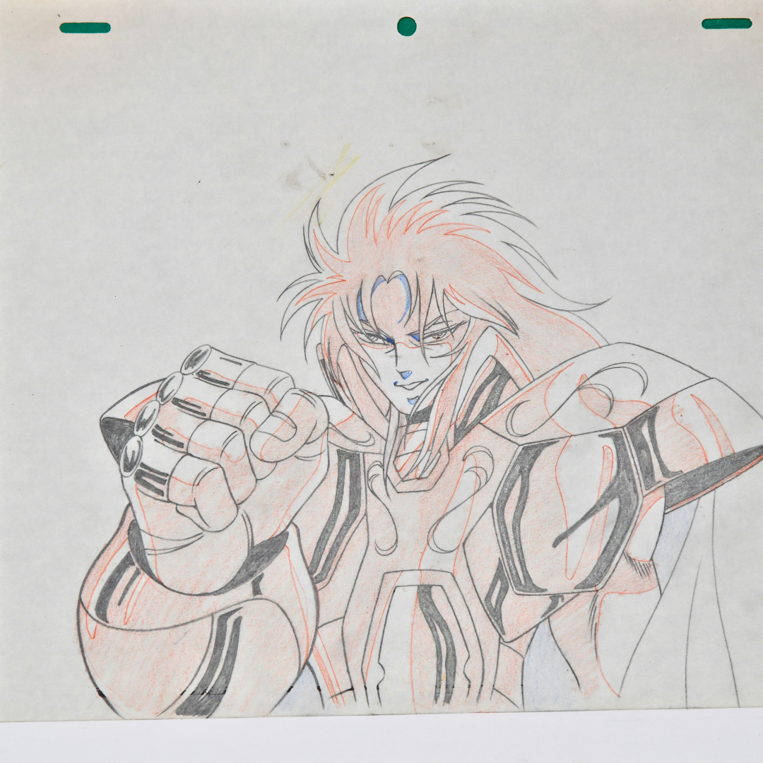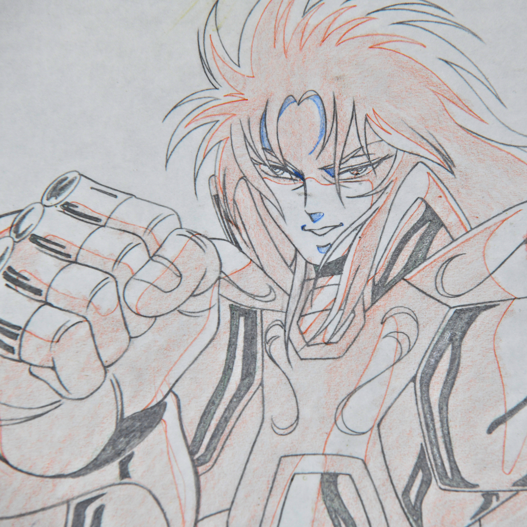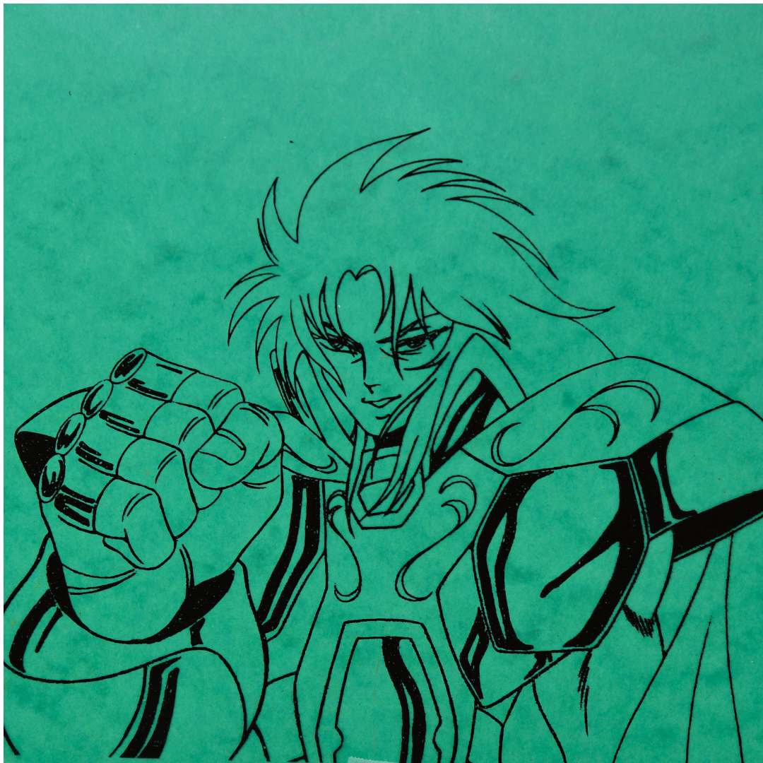 This original anime production cel and douga set features the formidable Saga, the Gemini Saint, during a critical battle from episode 73 of Saint Seiya.